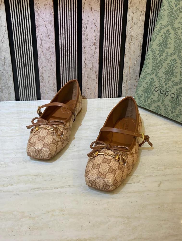 باليرينا Gucci بتصميم أنثوي أنيق، مزينة بنقشة GG الأيقونية باللون البيج مع تفاصيل جلدية باللون البني وإبزيم معدني ذهبي فاخر يضفي لمسة كلاسيكية على الإطلالة. تصميم مريح وعصري يناسب الإطلالات اليومية والمناسبات الراقية. يأتي بالعلبة الأصلية مع جميع الملحقات