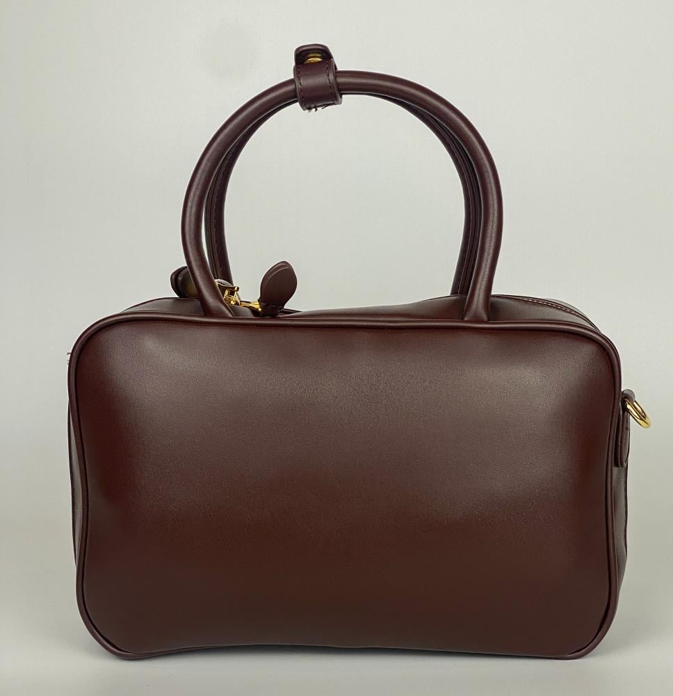شنطة ميوميو باللون البني الأنيق، تصميم عصري بحجم عملي يناسب الاستخدام اليومي. تتميز بشكل مستطيل مع يد علوية مريحة وسحاب علوي للإغلاق، مزينة بشعار Miu Miu البارز لمسة فاخرة.