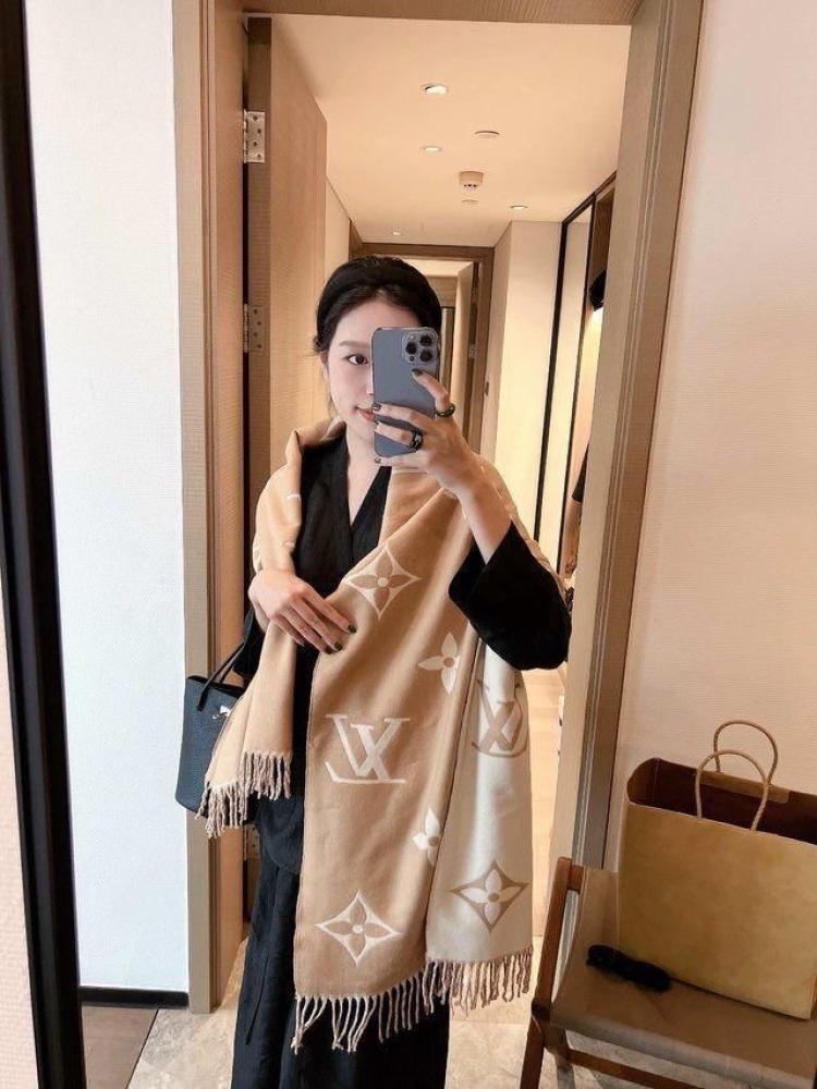 شال لويس فيتون باللون البيج الفاتح بنقشة LV البارزة بتصميم راقٍ يناسب جميع الإطلالات الشتوية.